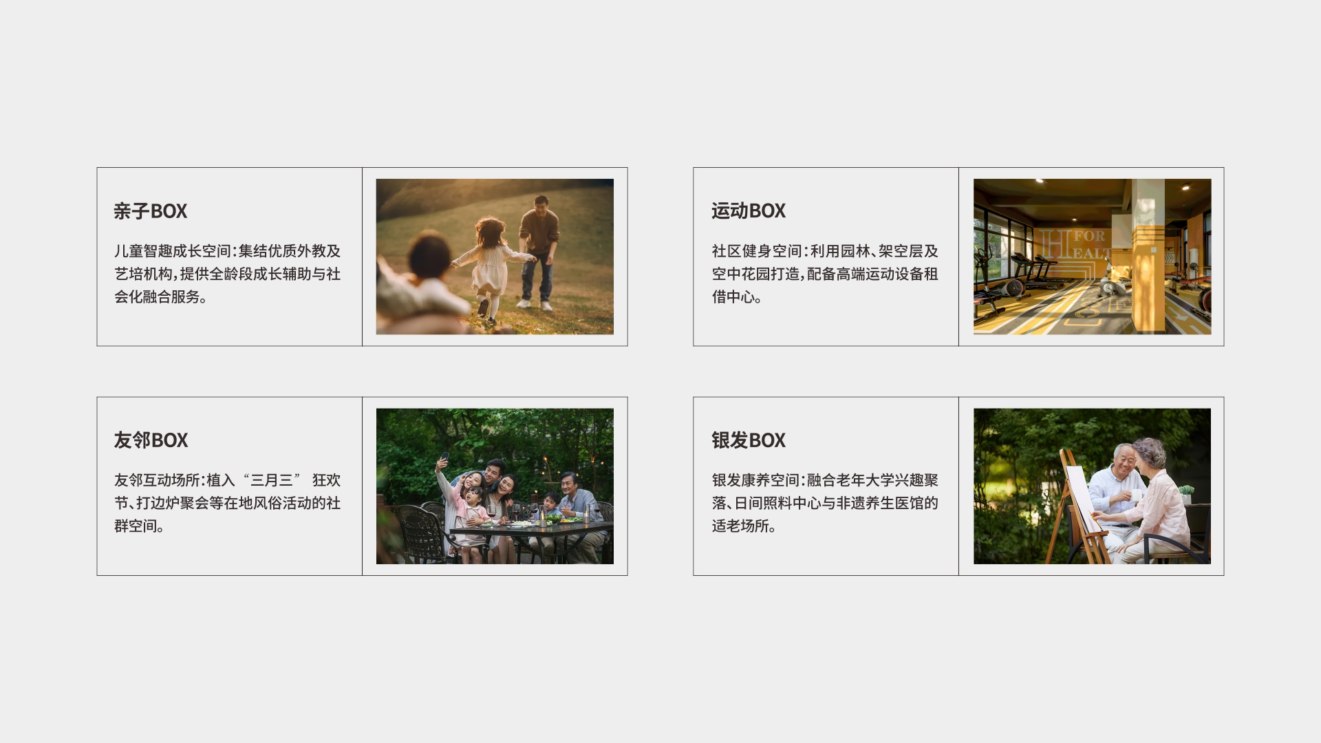 联动国际艺术生活资源,围绕家庭生活、运动健身、女性经济、银发经济、亲子萌宠、友邻社交、公益贡献等核心需求,构建 “国际化新生活配套盒子”。通过五大特色 BOX,形成覆盖全龄段、多场景的生活支持网络,让社区成为融合多元需求的生活共同体。